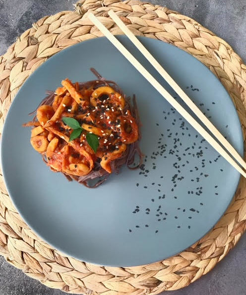 Ανακατεύουμε λίγο και συνεχίζουμε με τον πελτέ και τα καλαμάρια.