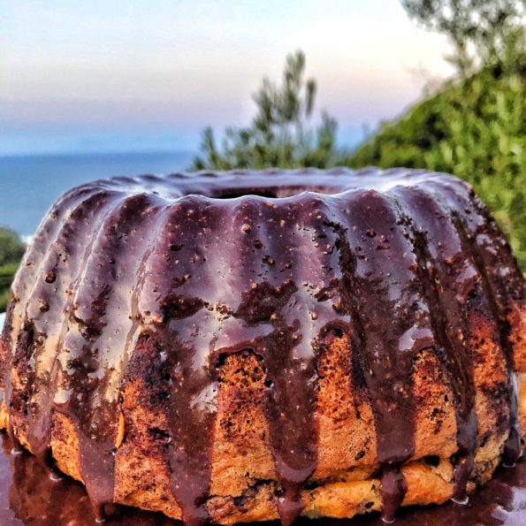 Once the cake is ready, let it rest for a couple of minutes and once it cools down we drizzle the glaze on top.