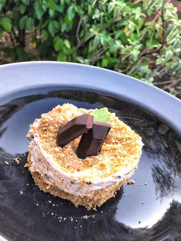 Όταν θέλουμε να σερβίρουμε, προσθέτουμε σε κάθε κομμάτι μερικά κομματάκια σοκολάτας και λίγο τριμμένο/σπασμένο μπισκότο. Μπορούμε να προσθέσουμε σιρόπι ή διάφορα σοκολατένια στοιχεία.