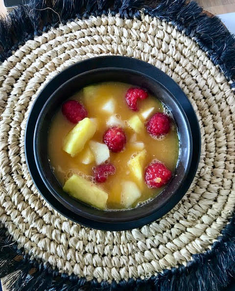 Cut the fruit in cubes and place them in the bowl together with the juice.