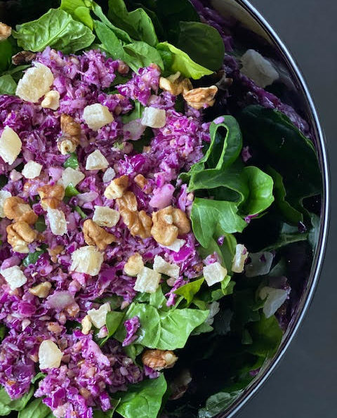 Put the vegetables in a salad bowl together with the pineapple and walnuts.