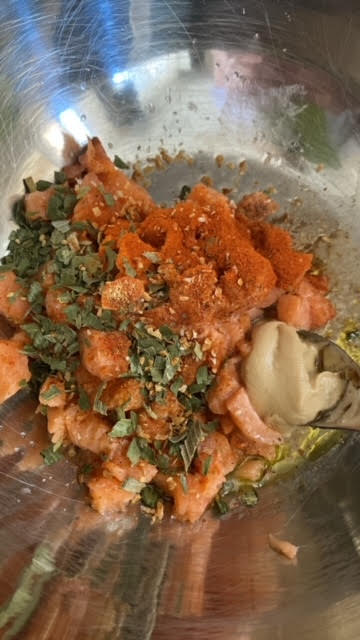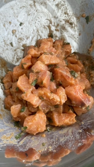 Add the salmon in a bowl together with lime, mustard, salt, pepper, chili, garlic, onion and chives.
