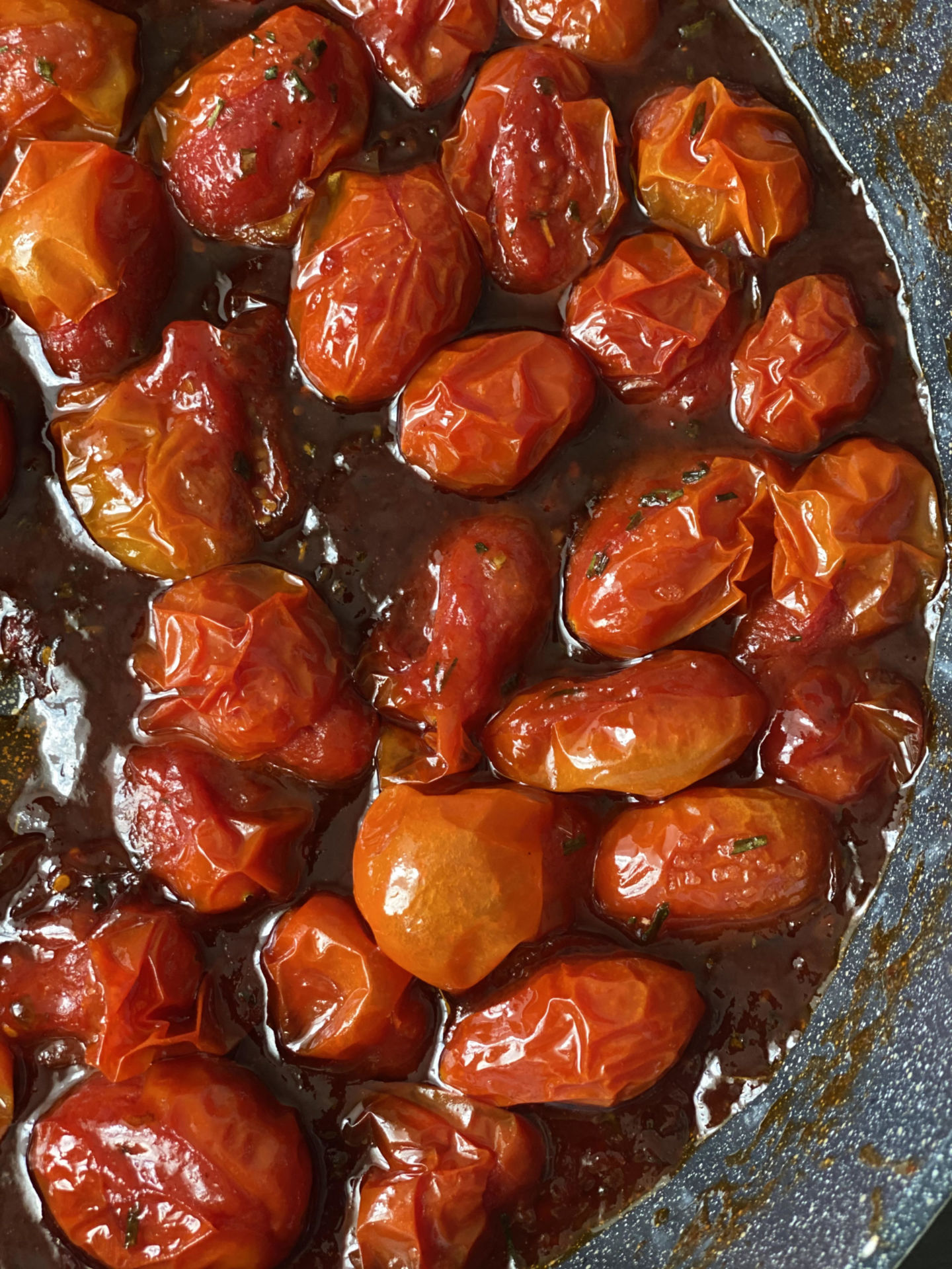 Ανακατεύουμε λίγο τα υλικά και προσθέτουμε τα ντοματίνια ολόκληρα.
