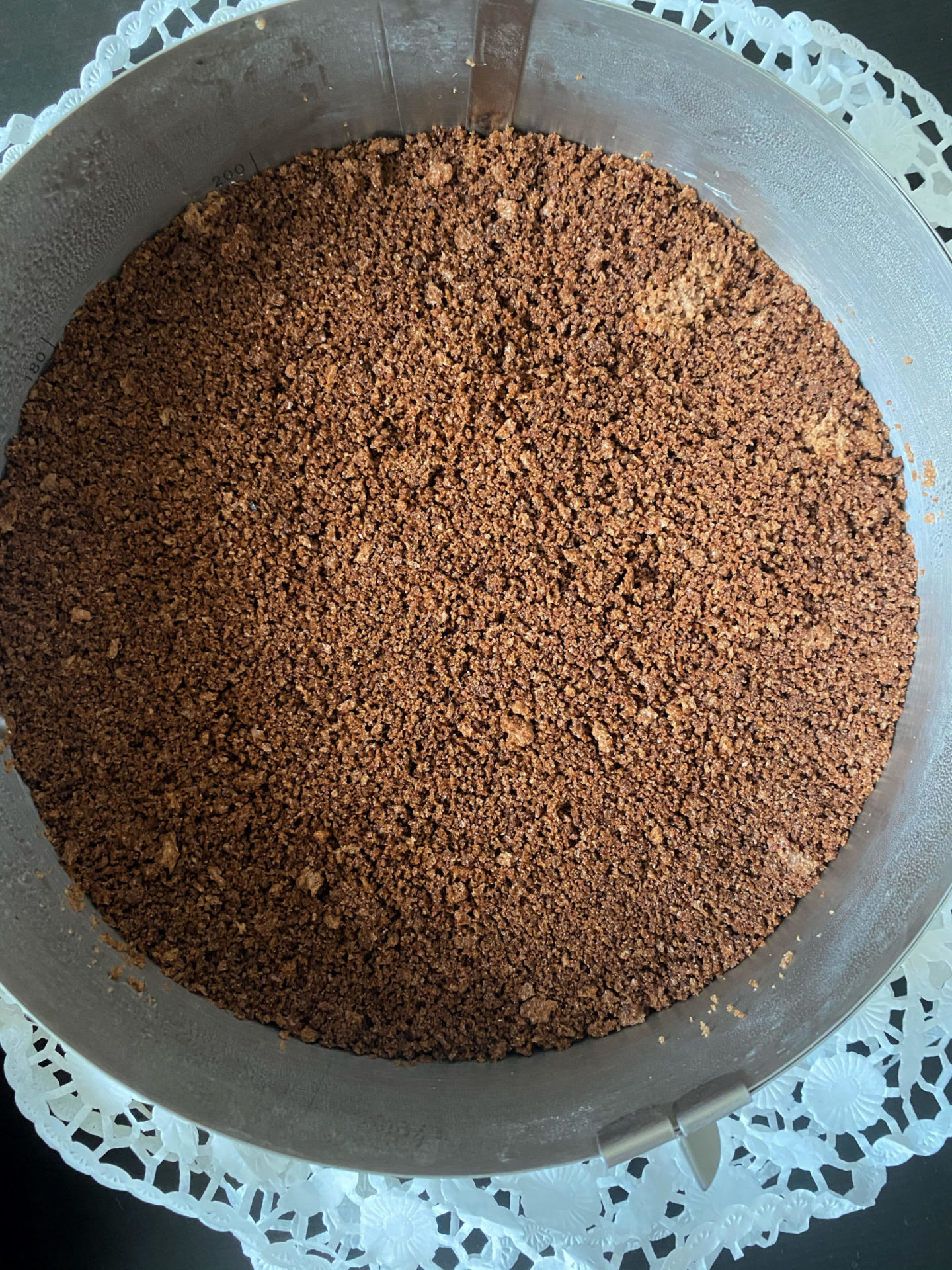 4. Αφήνουμε το μείγμα τυριών να έρθει σε θερμοκρασία δωματίου και το στρώνουμε στη φόρμα με το παξιμάδι.