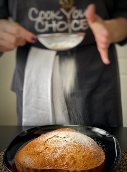 Όταν είναι έτοιμο αφήνουμε να κρυώσει λίγο, αφού ξεφορμάρουμε πασπαλίζουμε με ζάχαρη άχνη (προαιρετικά).