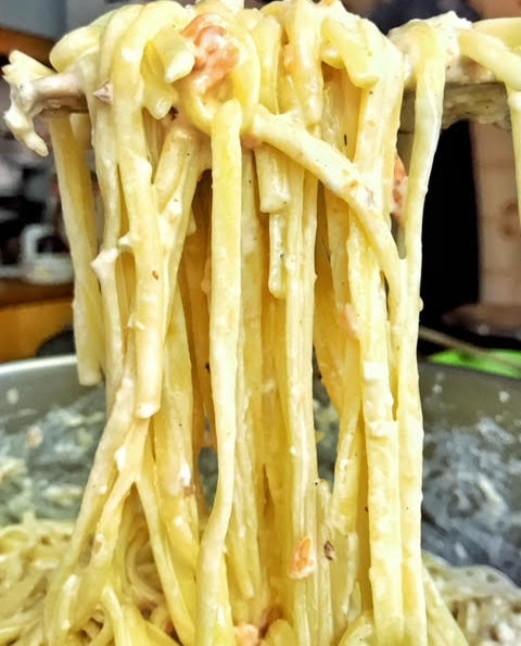 Στη στεγνή κατσαρόλα, προσθέτουμε το λάδι και το μπέικον κομμένο. Σοτάρουμε για ένα λεπτό και ρίχνουμε πίσω στην κατσαρόλα τα λινγκουίνι.