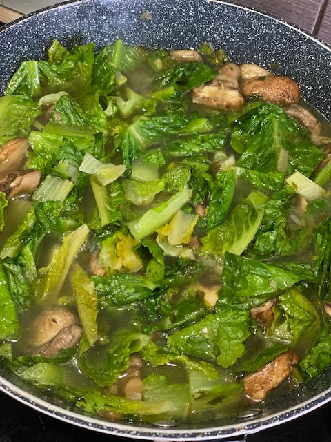 4. Στη συνέχεια προσθέτουμε τα χονδροκομμένα μαρούλια και το ζωμό λαχανικών.