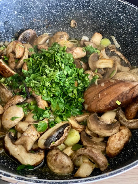 3. Εντωμεταξύ ψιλοκόβουμε το φρέσκο κρεμμυδάκι και το μαϊντανό