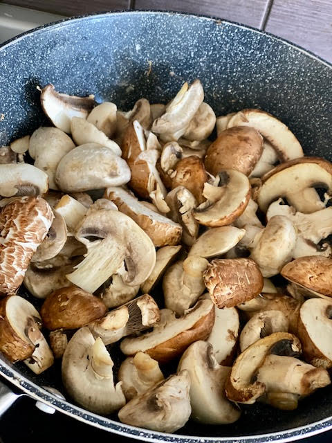 Σοτάρουμε τα μανιτάρια, ώστε να μαραθούν χωρίς λιπαρή ουσία στην αρχή.