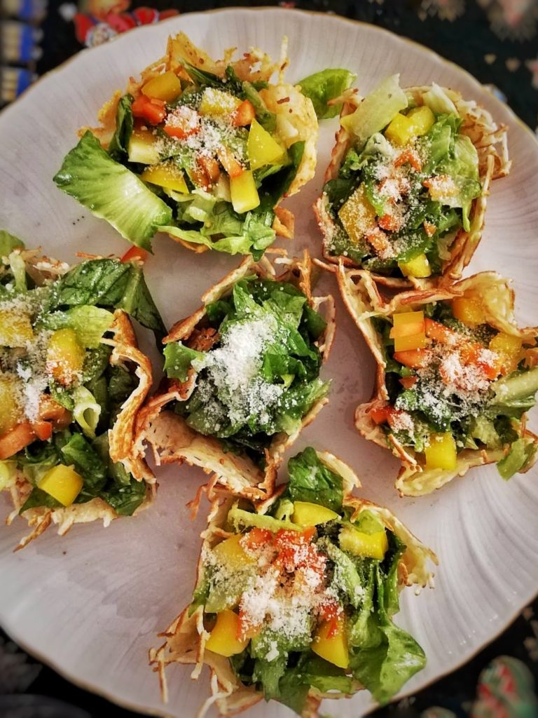 Προσθέτουμε τη σάλτσα που φτιάξαμε στο μπολ με τη σαλάτα, ανακατεύουμε και γεμίζουμε με αυτήν τα καλαθάκια. Γαρνίρουμε με λίγη παρμεζάνα.