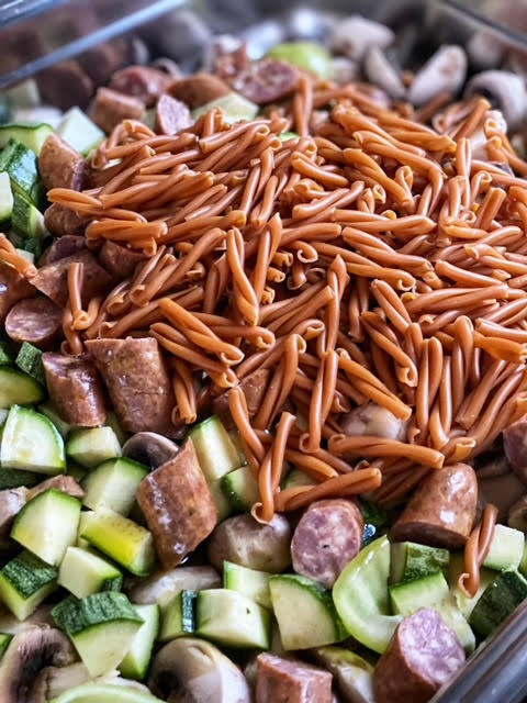 Τα βάζουμε όλα σε ένα μεγάλο ταψί, να μην είναι πολύ στριμωγμένα και απευθείας προσθέτουμε τα ζυμαρικά και όλα τα υπόλοιπα υλικά (λάδι, νερό, πελτέ, αλατοπίπερο).
